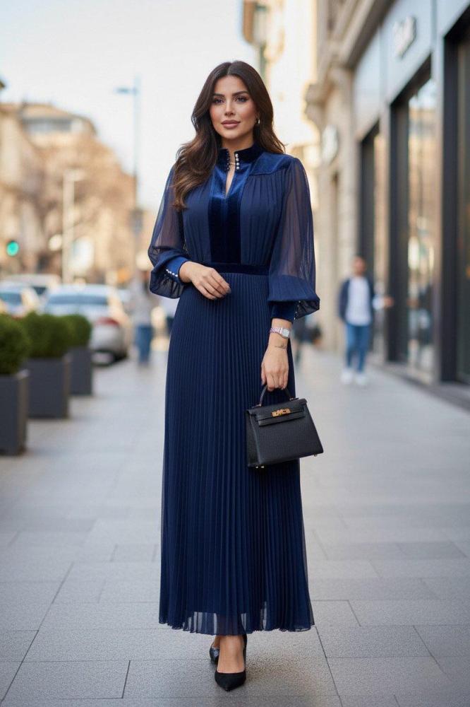 فستان شيفون ازرق بلاسيه بأطراف مخمل
