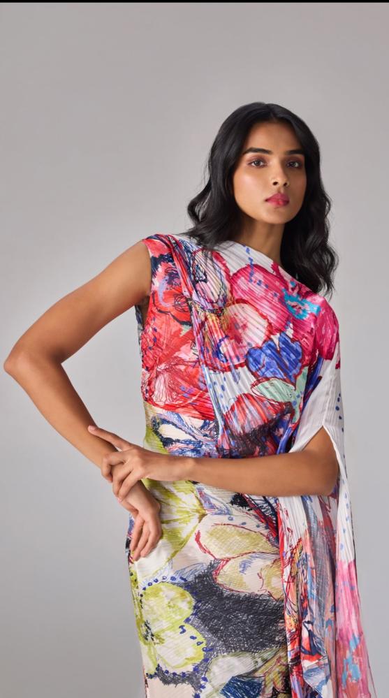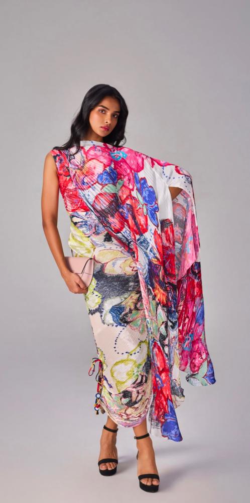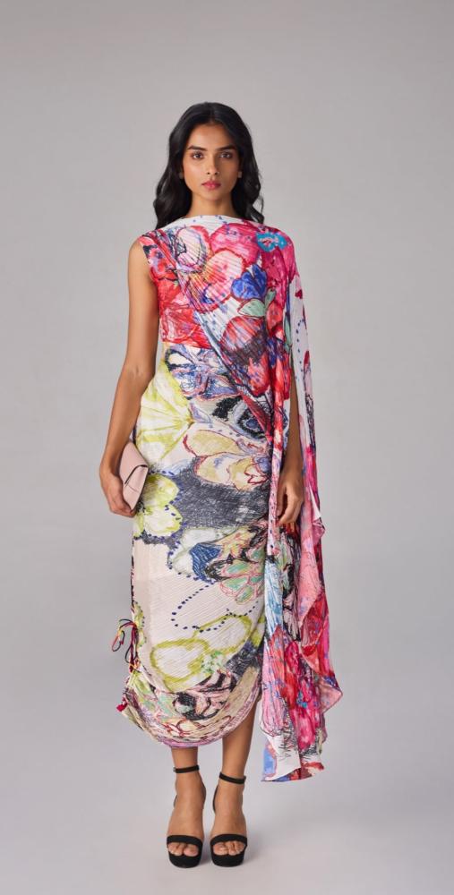 فستان بطبعة زهور تجريدية، مطوي يدويًا بثنيات دقيقة، بطابع كاڤتان، مع طول قابل للتعديل بواسطة أربطة، وقصاصات تدلى من الأكتاف