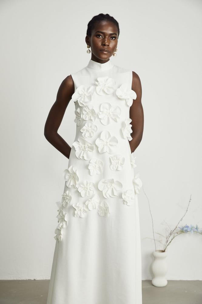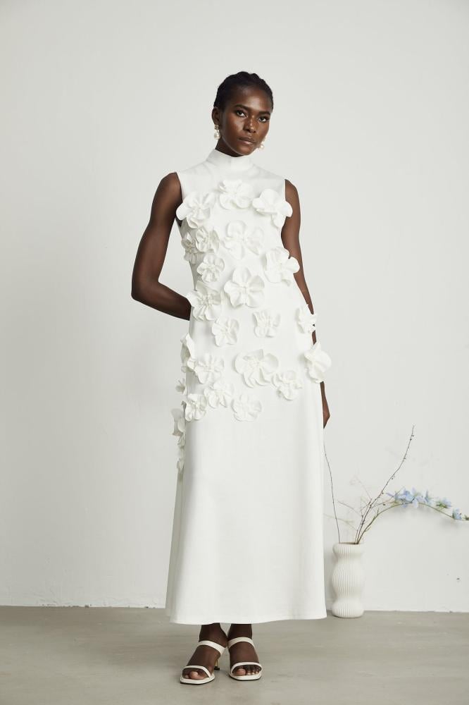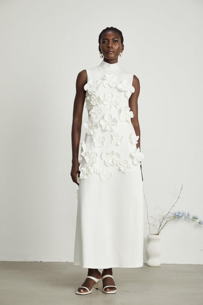 MAGALI BOW-TIE FAUX-FLOWER EMBELLISHED SLEEVELESS MAXI DRESS IN WHITE
