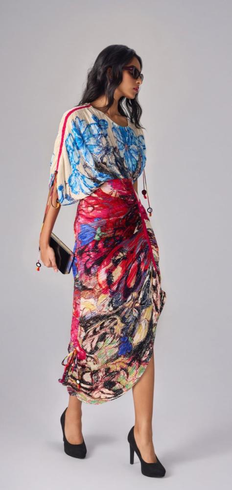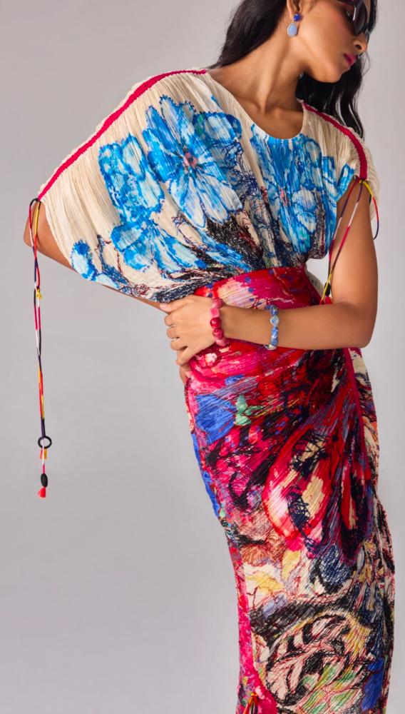 فستان بطابع القفطلن بطبعة زهور تجريدية، مطوي يدويًا بثنيات دقيقة، مع أكمام وطول قابلين للتعديل من خلال أربطة مطرزة يدويًا بالمرآة والشُرّابات